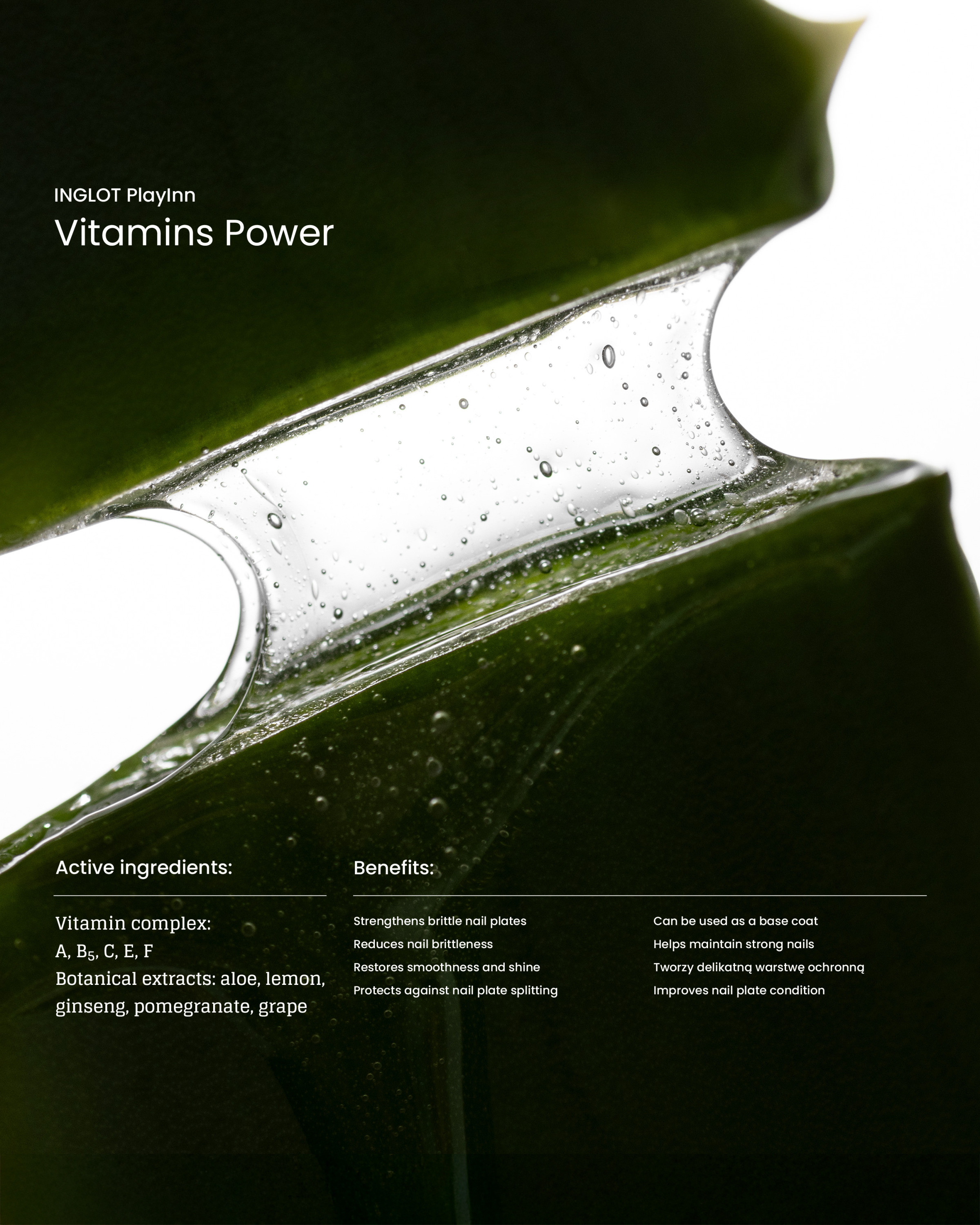 The INGLOT PLAYINN Vitamins Power Nail Conditioner is a strengthening formula that helps reduce nail plate brittleness. As many as 90% of participants confirmed that the product strengthens thin nails*, and 95% stated it restores smoothness and shine*. Its transparent formula can be used as a base coat, offering both protection from external factors and a healthy appearance. It’s ideal for thin, fragile nails prone to splitting and breakage.
